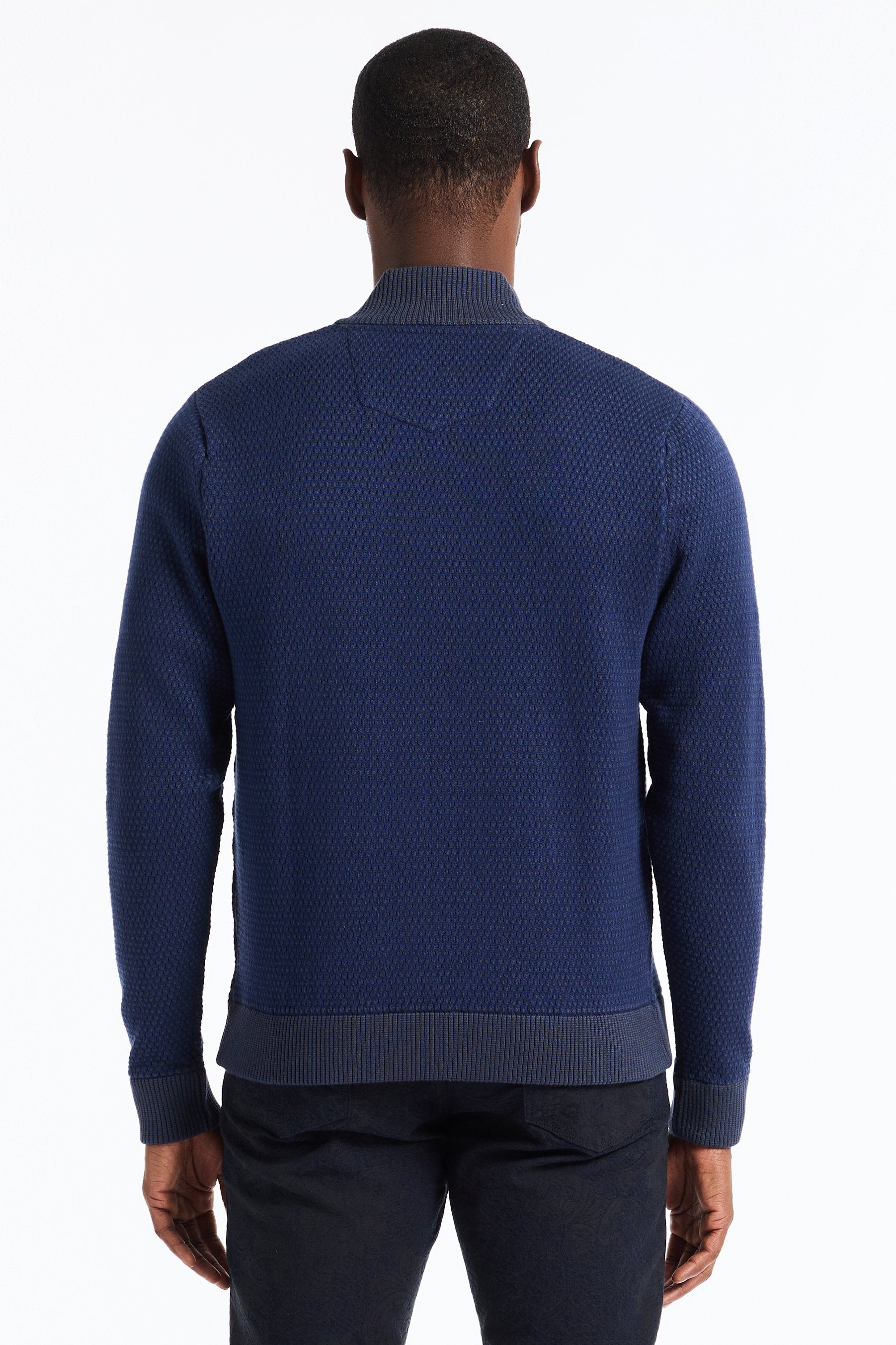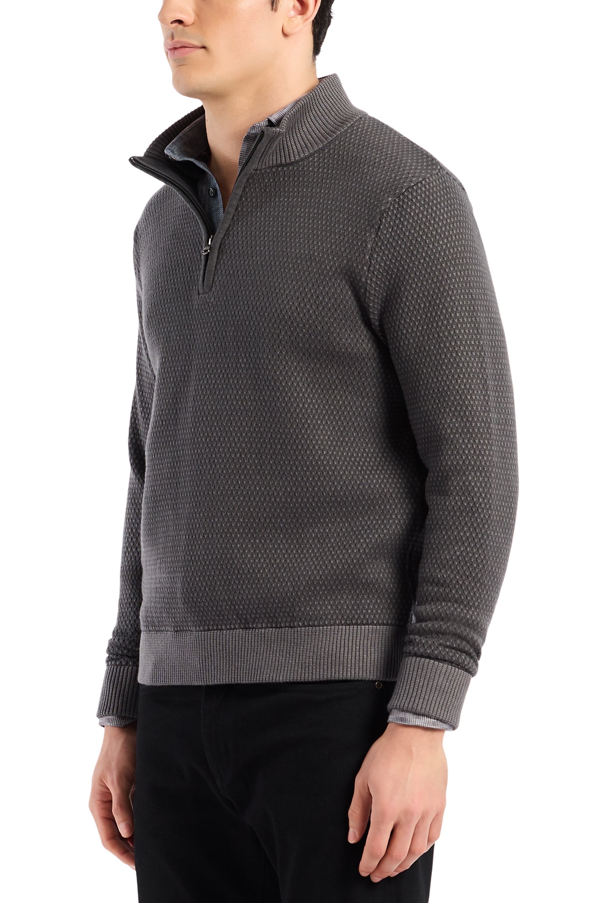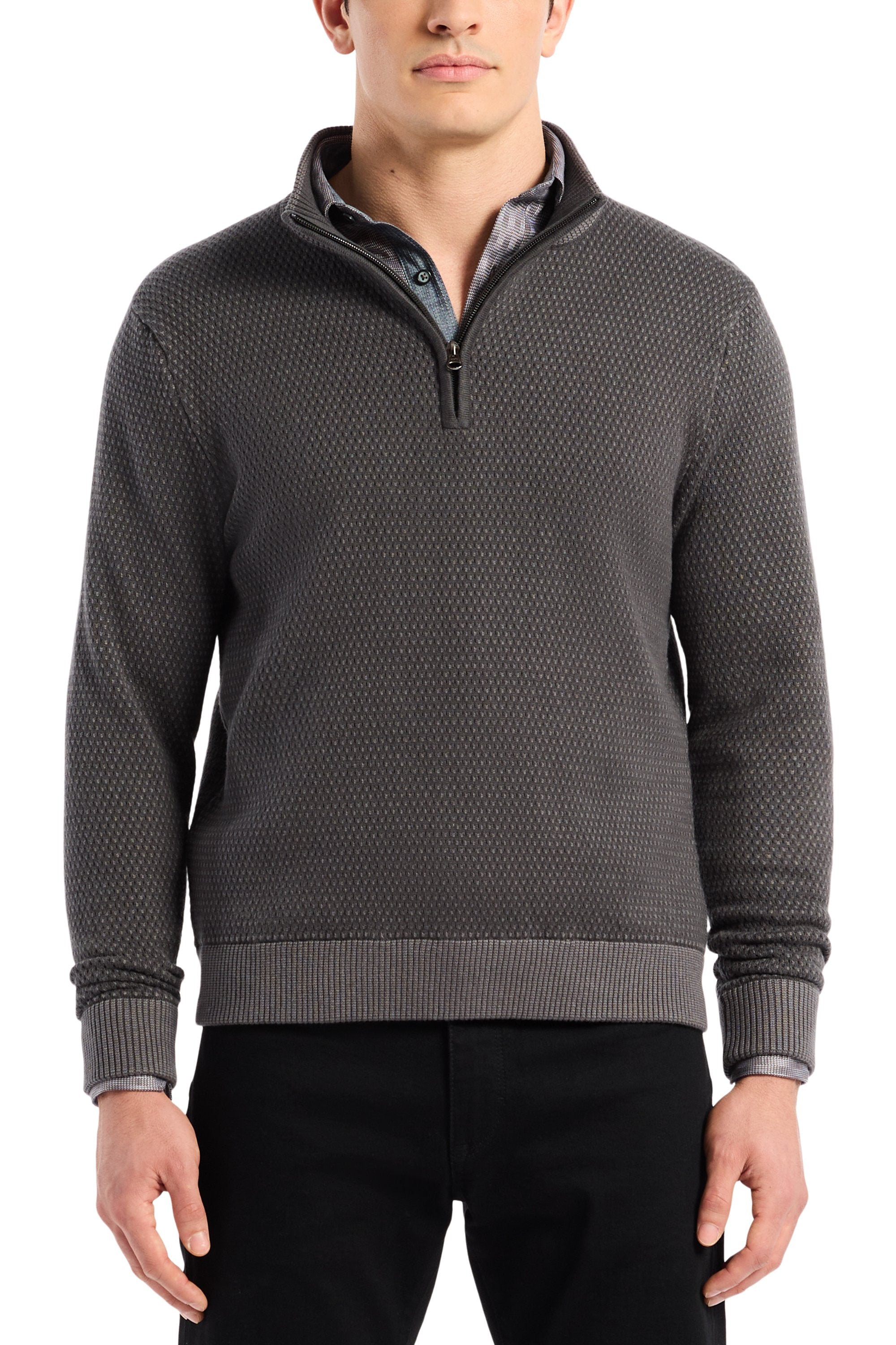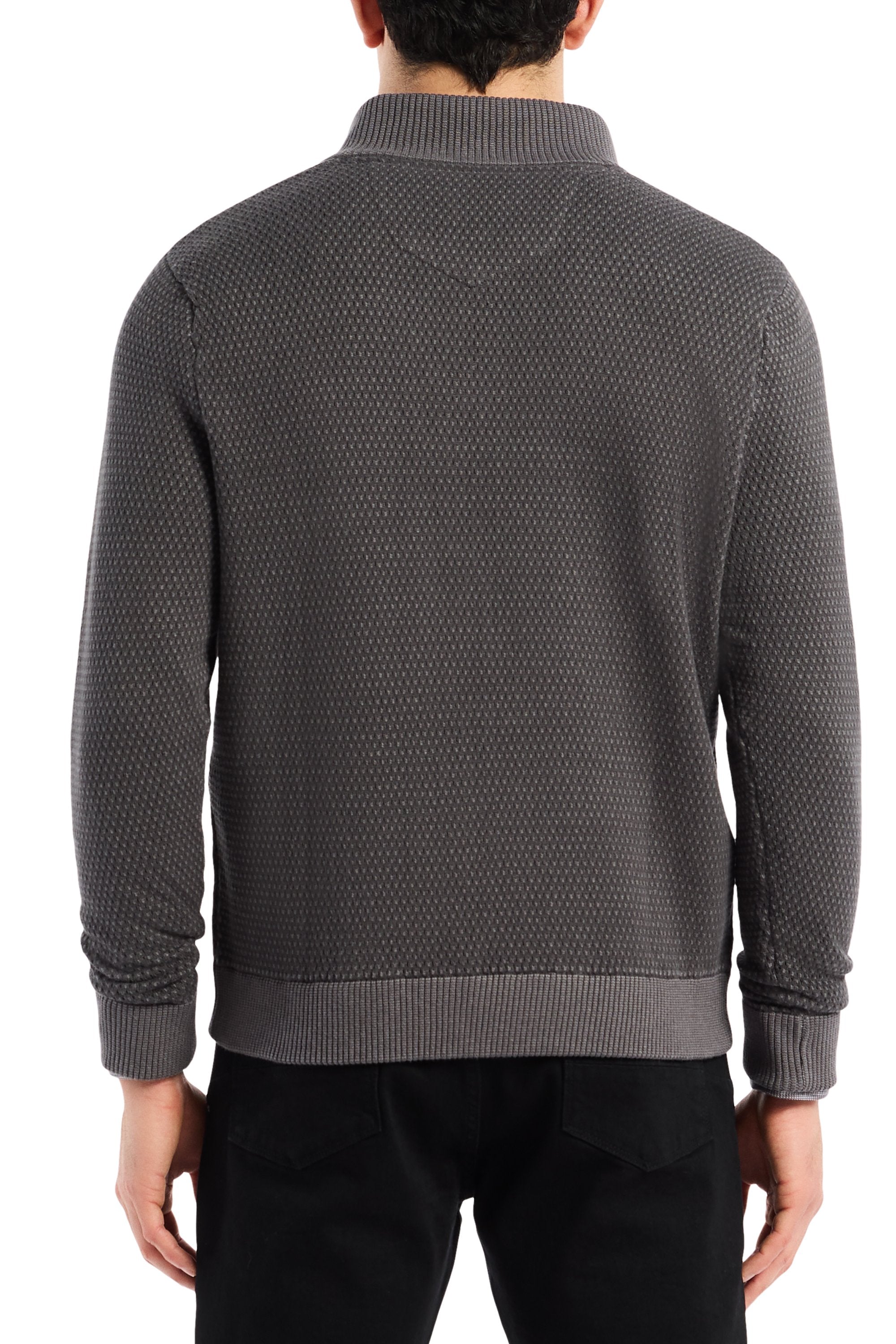 This quarter zip sweater combines simplicity with subtle sophistication. The ultra-soft style is enhanced by a slight textured finish, giving the piece a refined yet relaxed feel. Ribbed details at the collar, cuffs, and hem add a touch of structure, making it a versatile and comfortable choice for layering or wearing on its own.