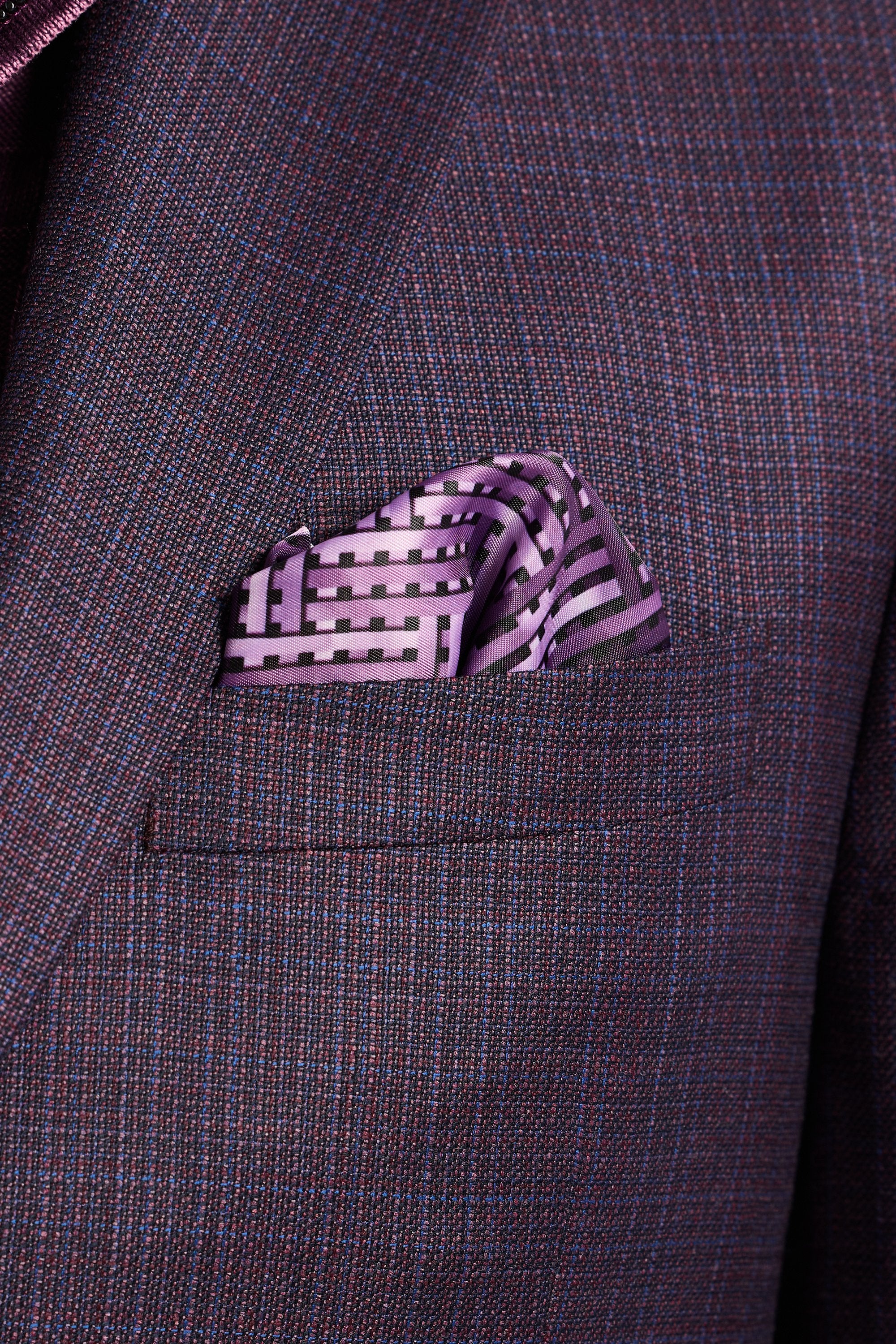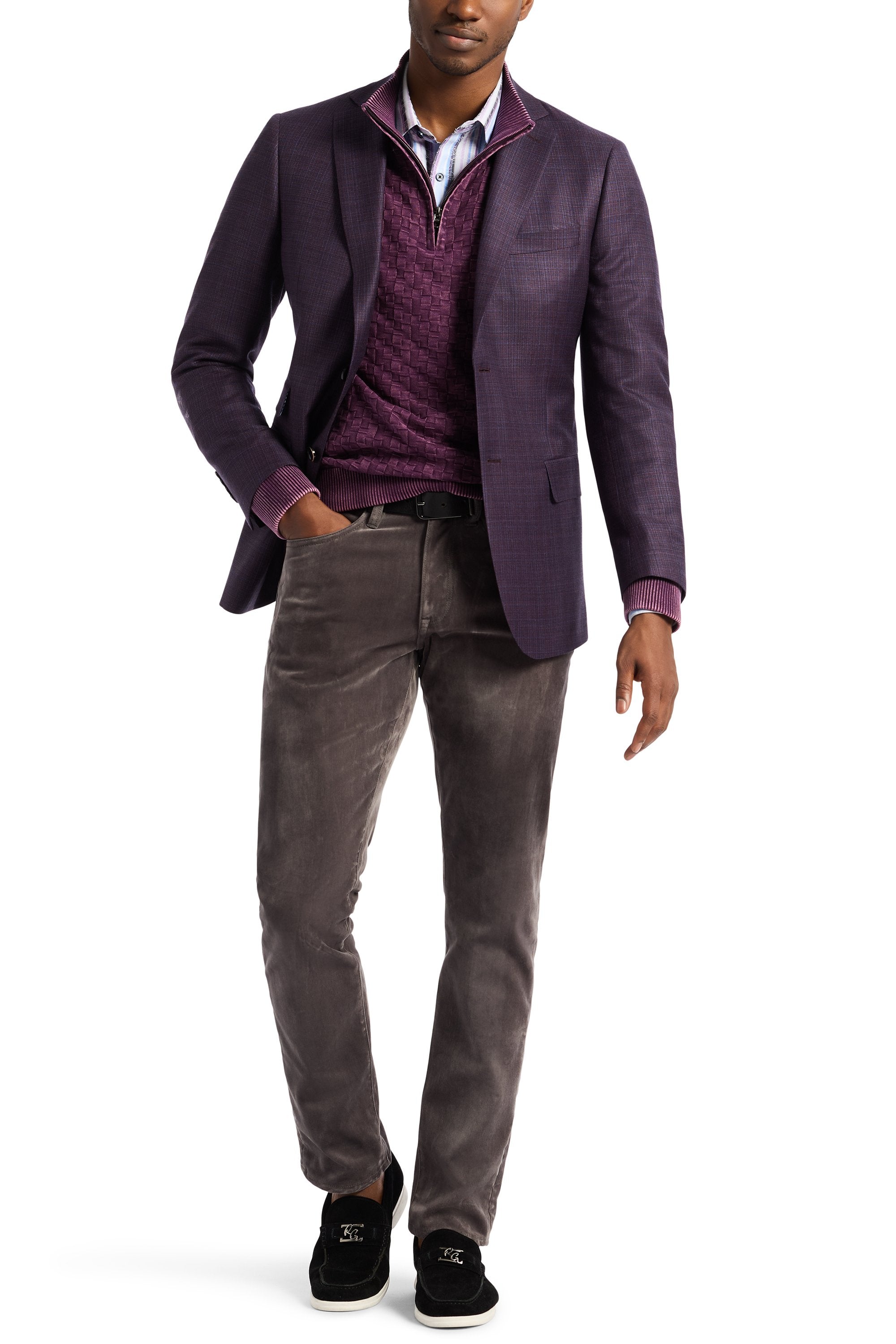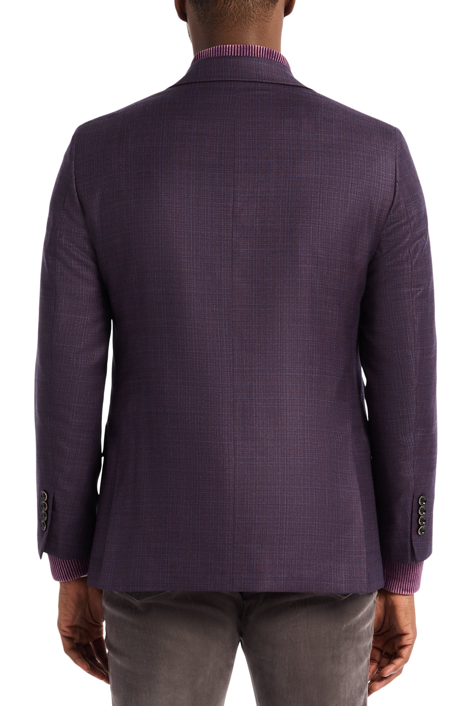 This luxe blazer features a rich berry-hued exterior with subtle blue threading throughout. The sophisticated design includes three exterior flap pockets plus a distinctive fourth pocket with a pull-out pocket square that perfectly matches the interior lining. Three discreet interior pockets provide practical storage without compromising the blazer's elegant silhouette. A perfect balance of bold Robert Graham style and refined tailoring. Don't miss the fashion timekeeper at the interior—an RG reminder that true style is timeless.