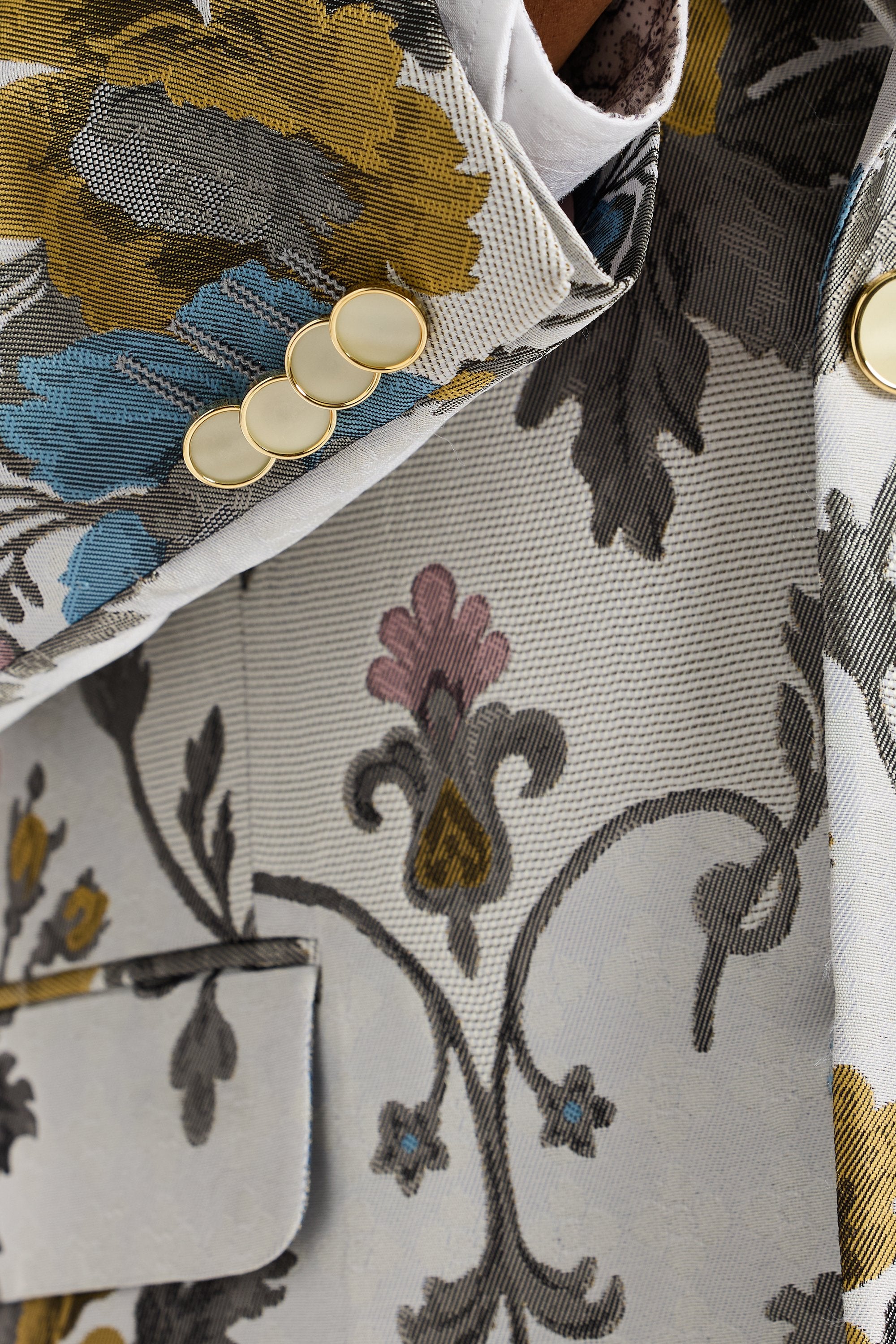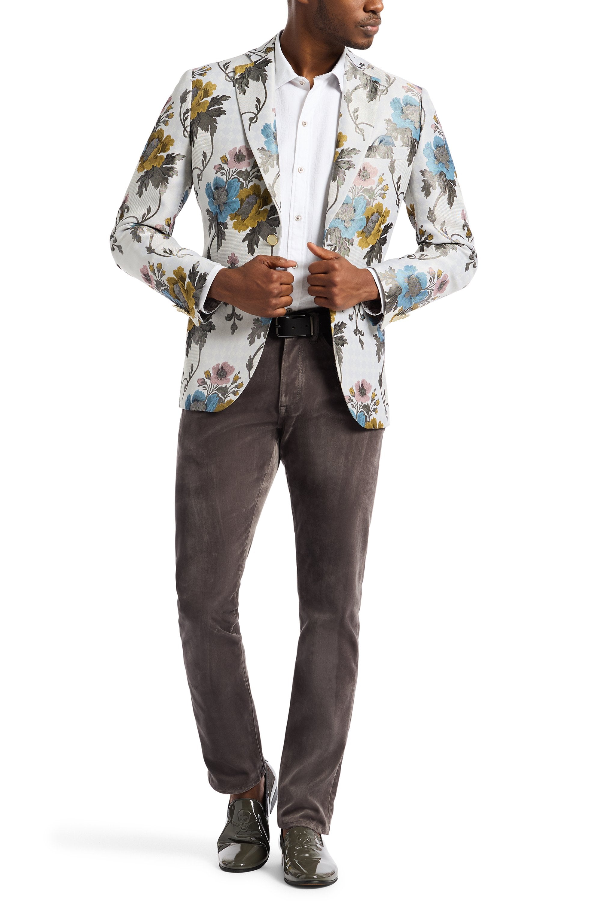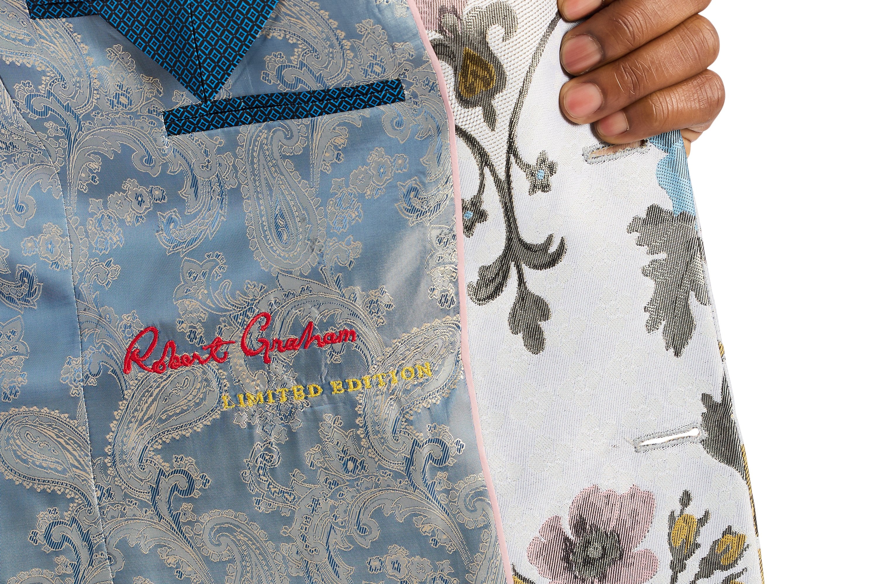 When art meets tailoring, every entrance becomes a Grand Entrance. This extraordinary piece transforms classic menswear with an opulent tapestry of florals in rich blues, golden yellows, and dusky roses against pristine ivory. The intricate botanical motifs dance across premium fabric, while gold-toned buttons add the perfect finishing touch. Inside, our signature paisley lining in ocean blue creates a sophisticated contrast that speaks to an eye for detail. From gallery openings to garden parties, this limited edition masterpiece ensures you'll never blend into the background, you'll own the room.