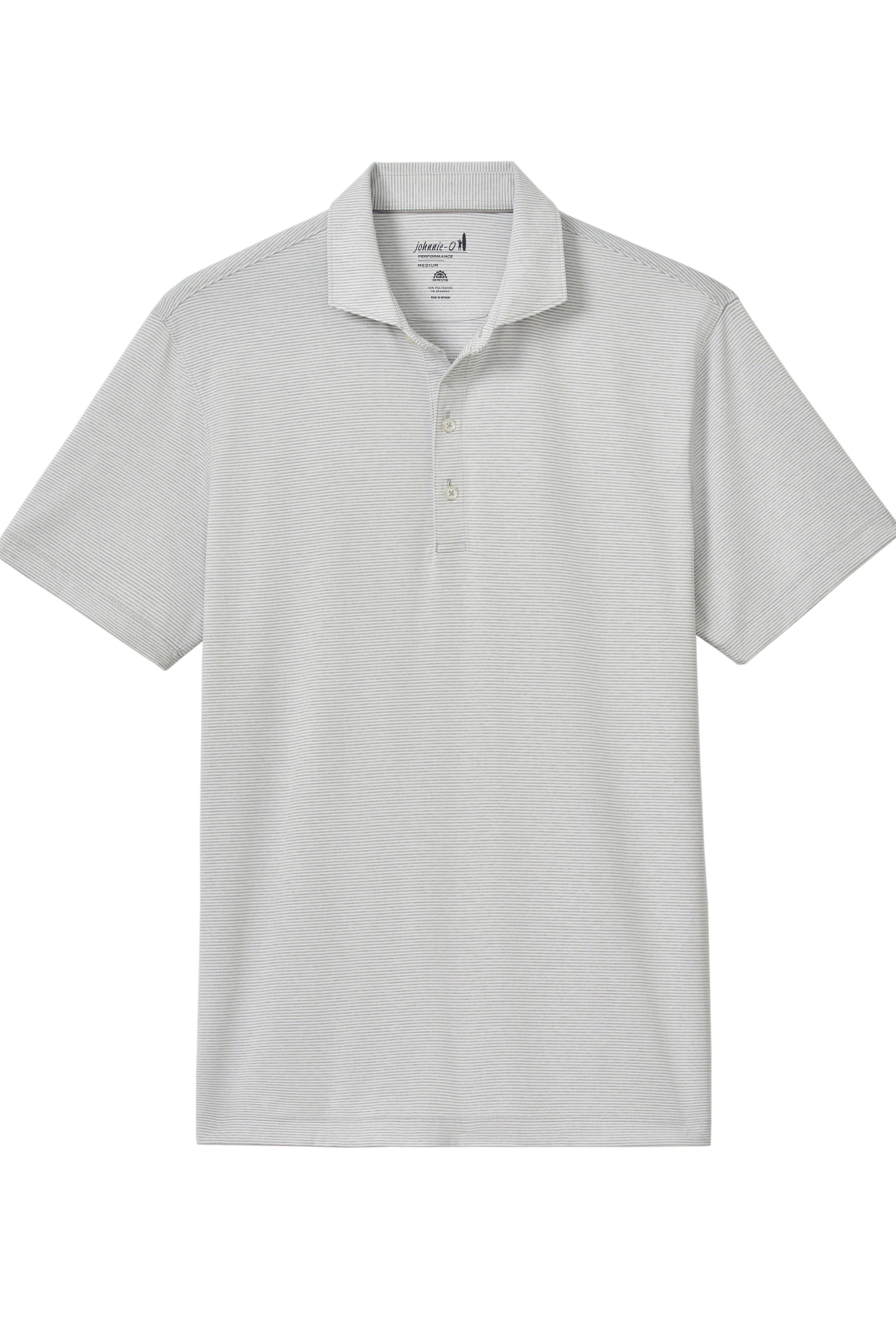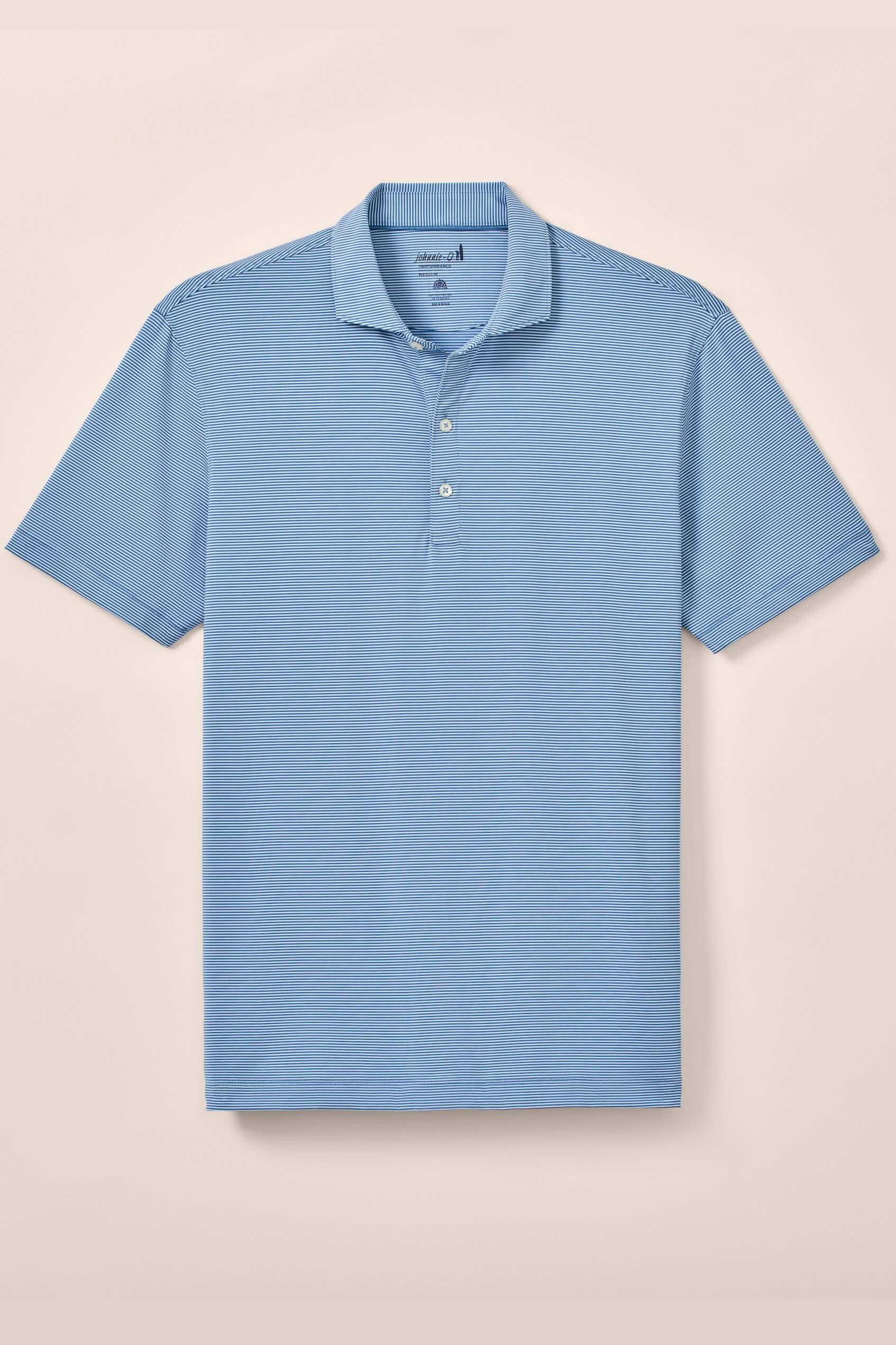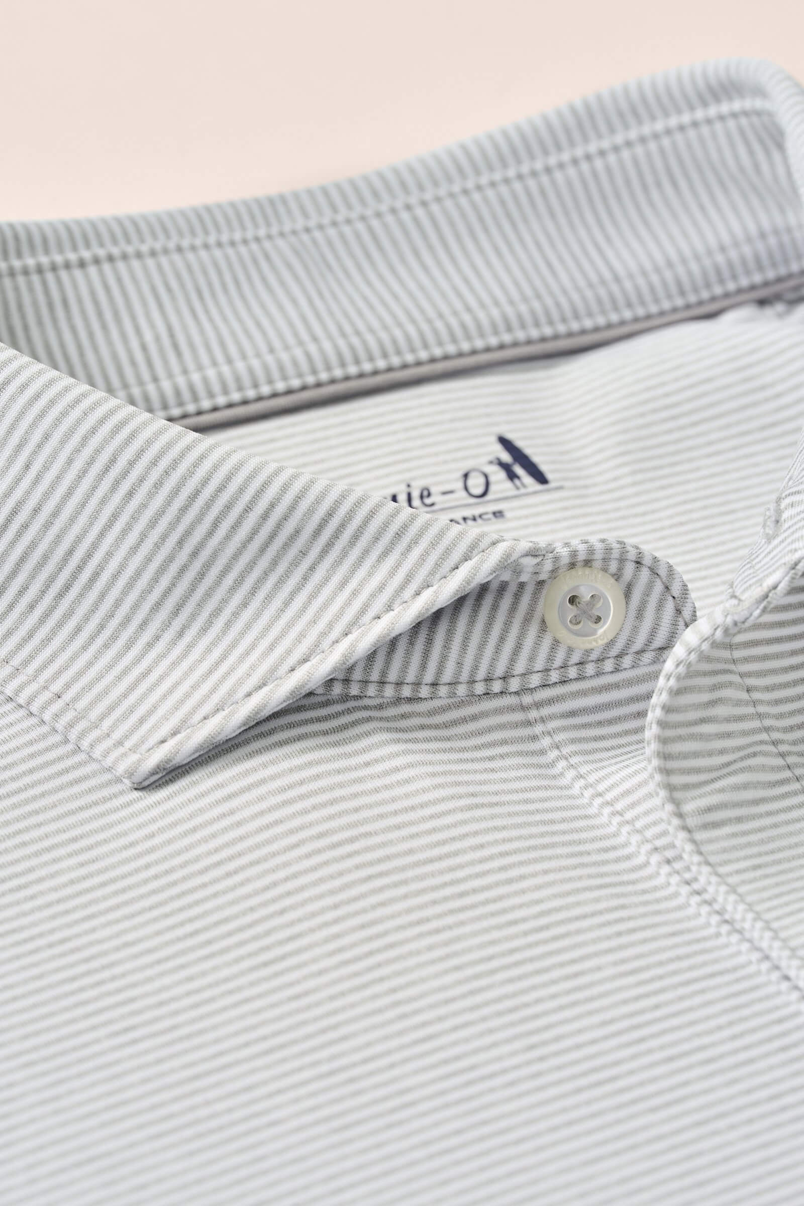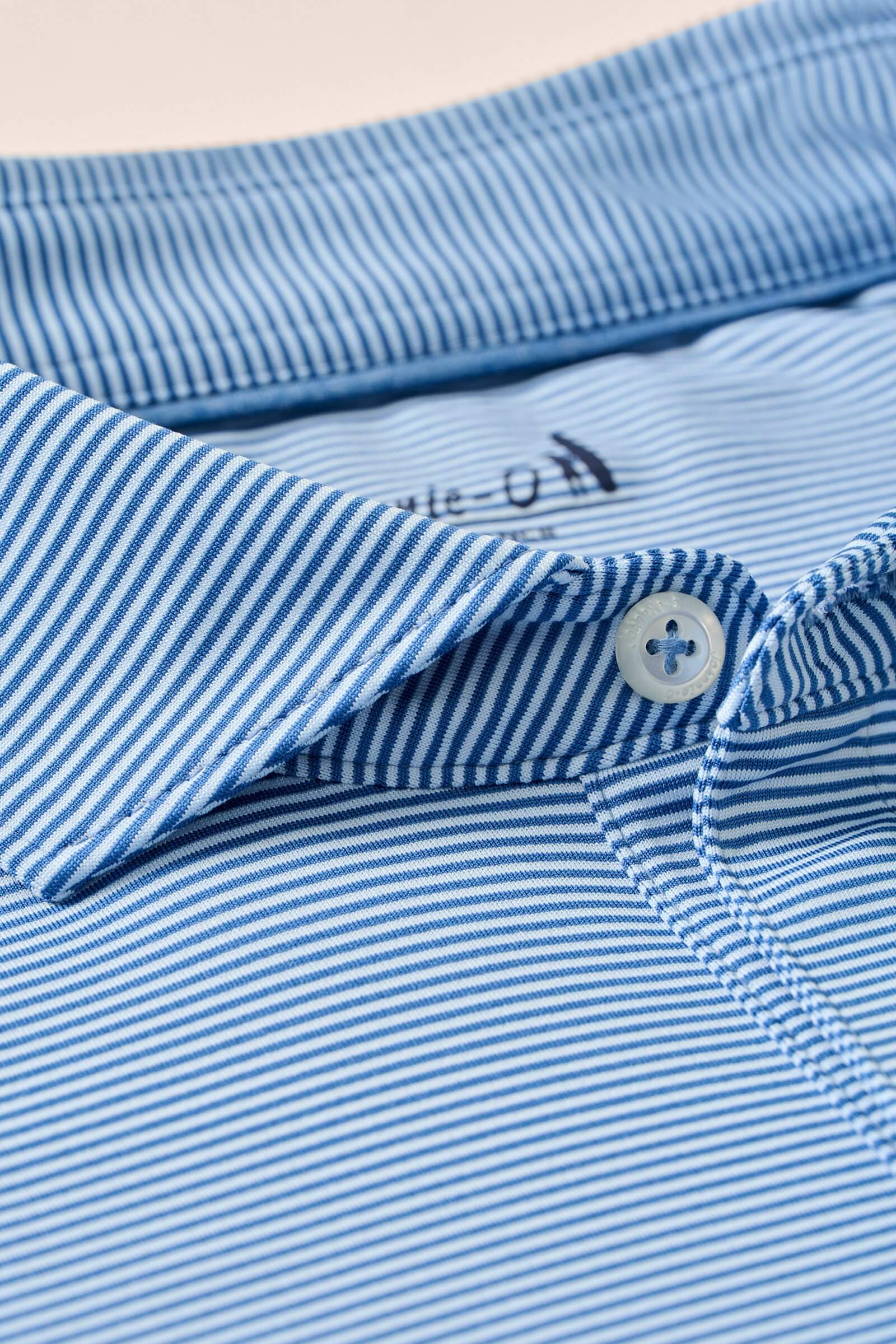 PINSTRIPE PERFORMANCE 3 BUTTON POLO - SIDE VENTS LEFT CHEST OPEN - EMBROIDERED LOGO ON CENTER BACK YOKE - MOISTURE WICKING - UPF 50 SUN PROTECTION