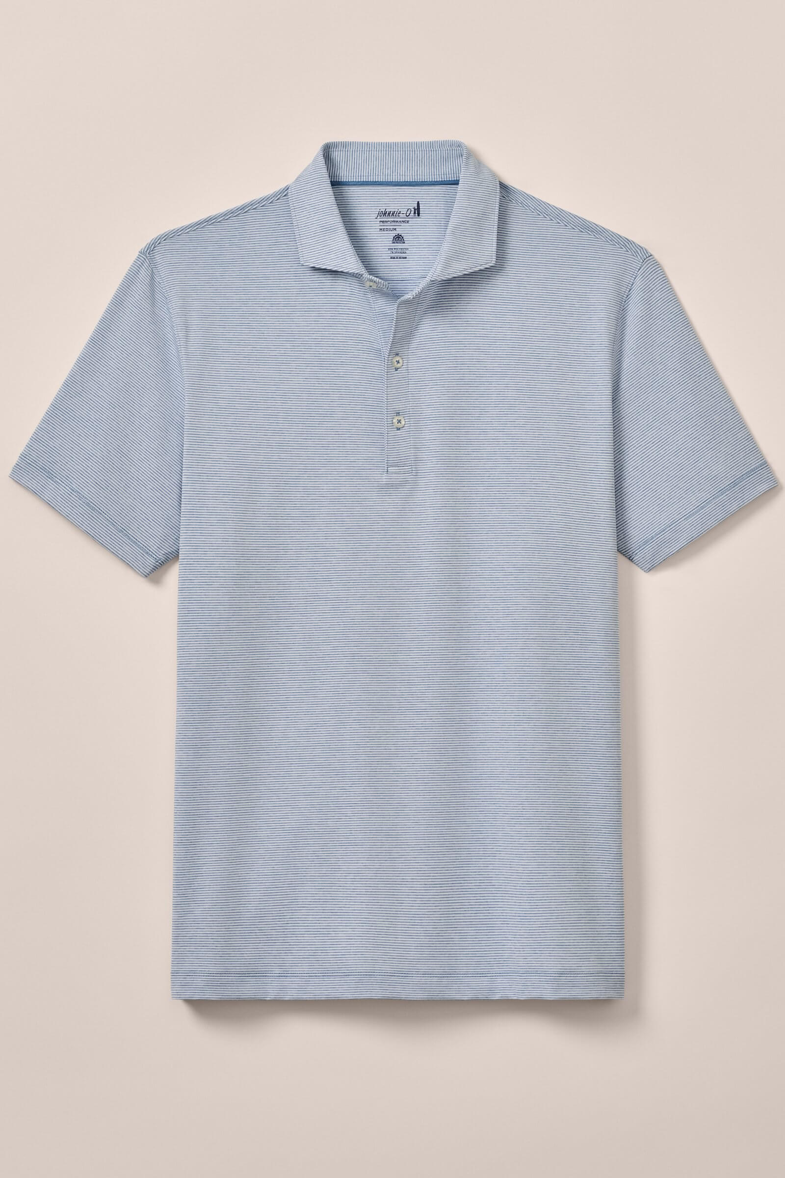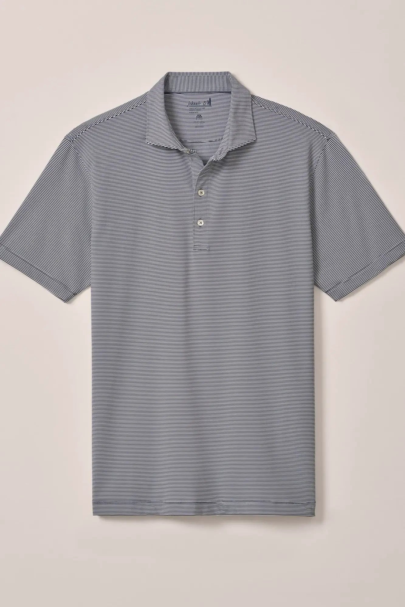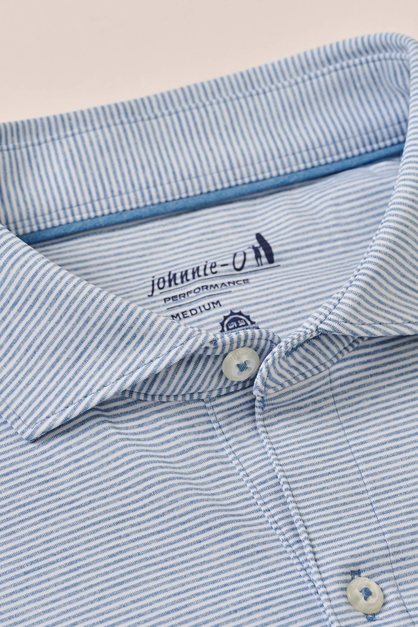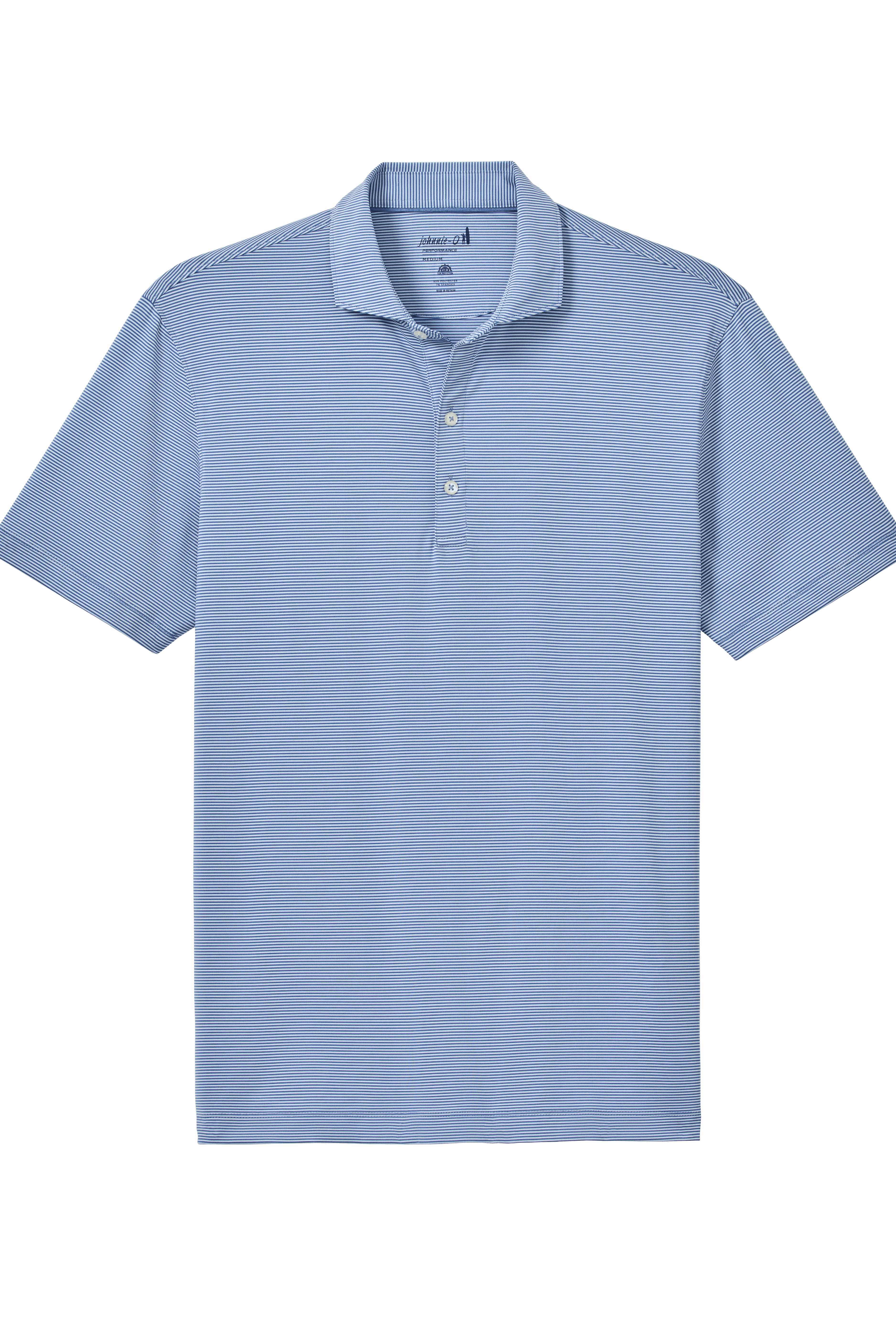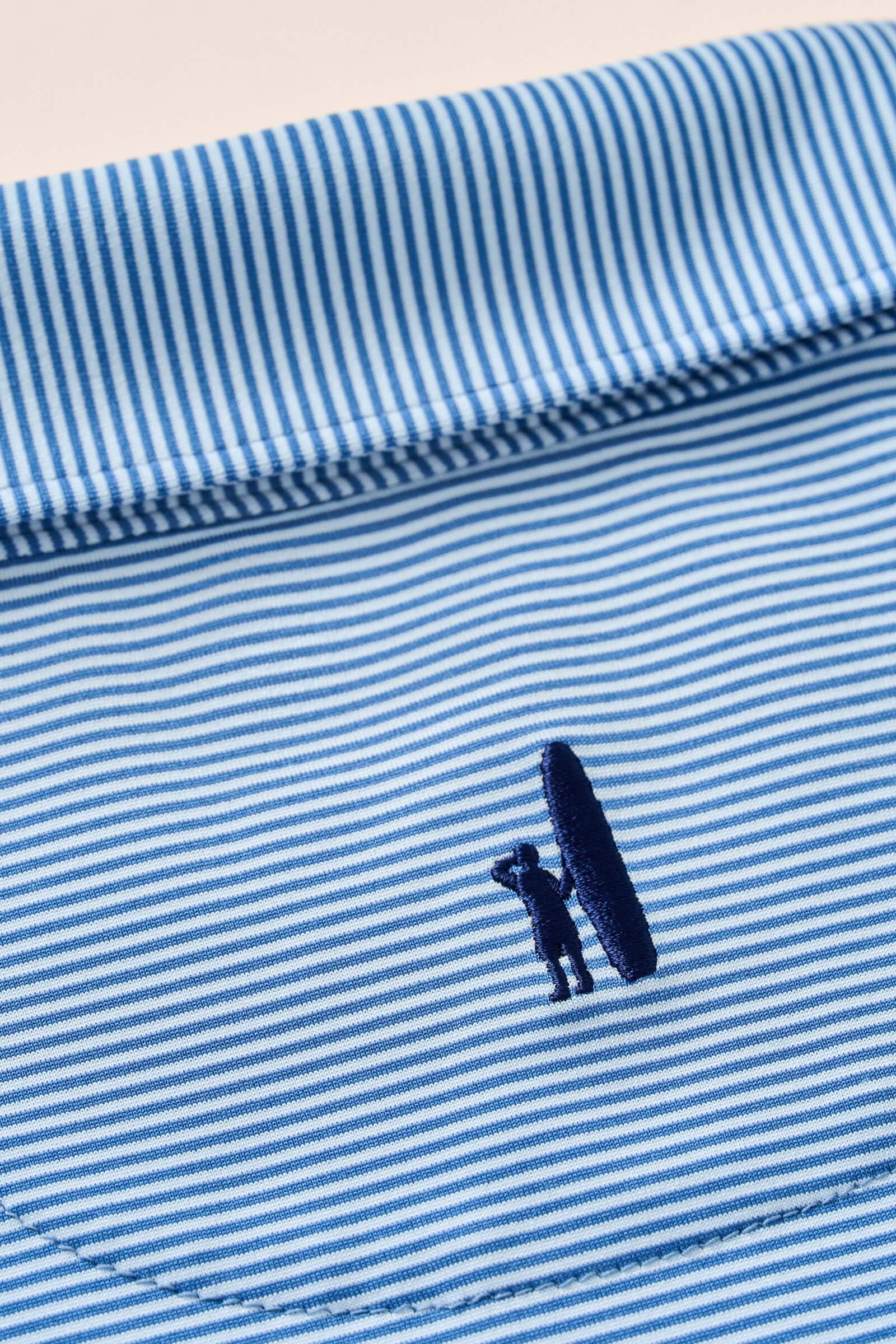 PINSTRIPE PERFORMANCE 3 BUTTON POLO - SIDE VENTS LEFT CHEST OPEN - EMBROIDERED LOGO ON CENTER BACK YOKE - MOISTURE WICKING - UPF 50 SUN PROTECTION