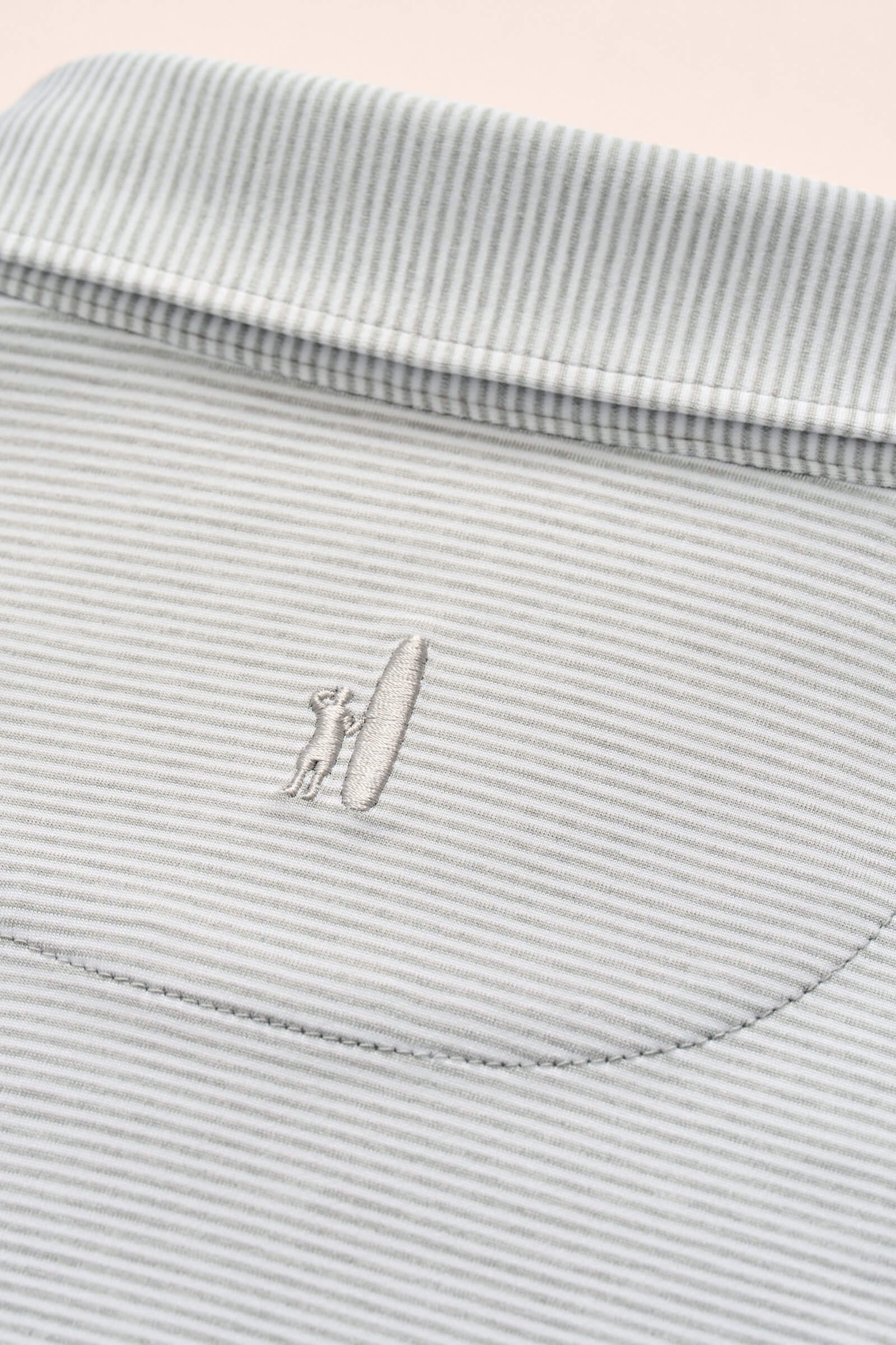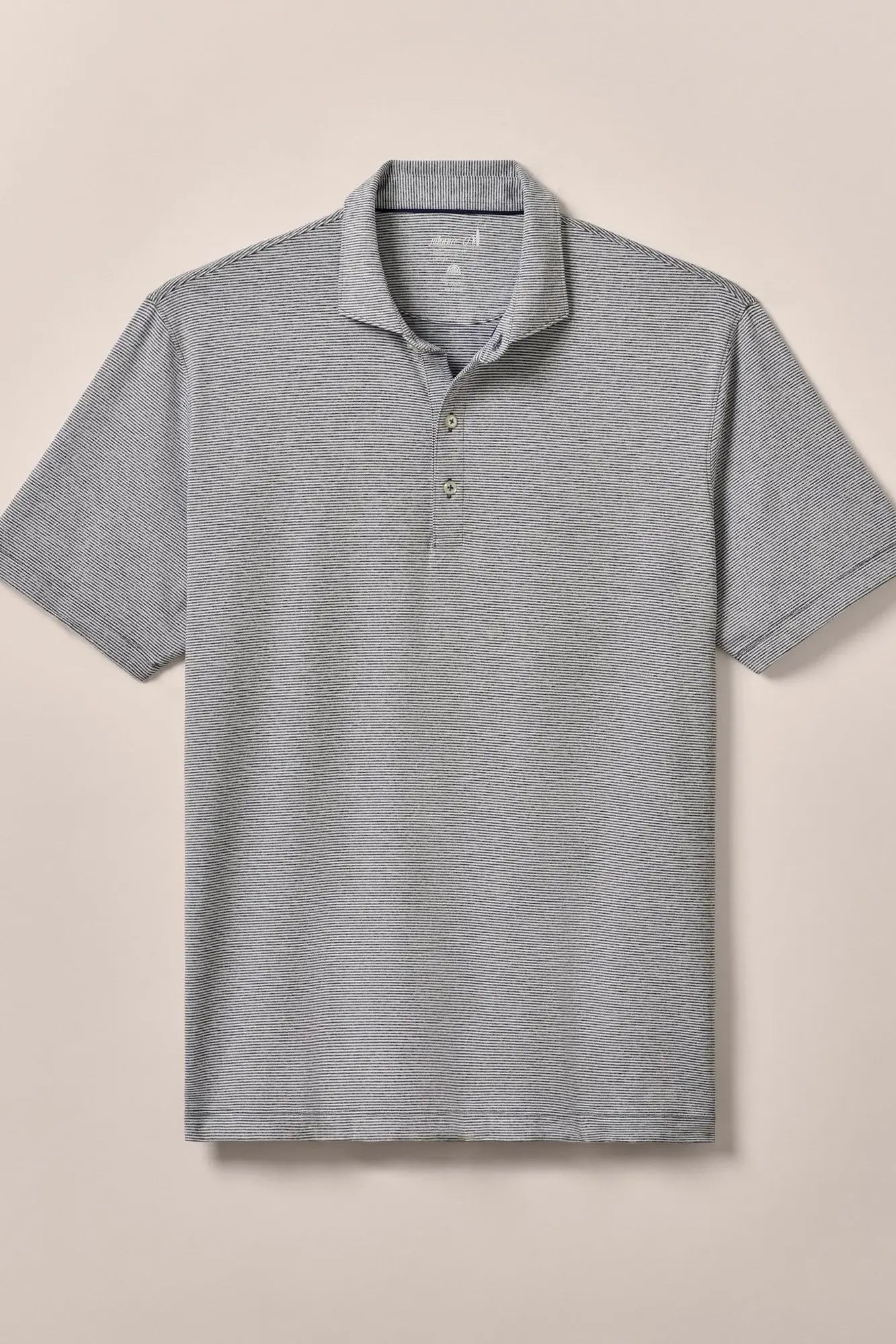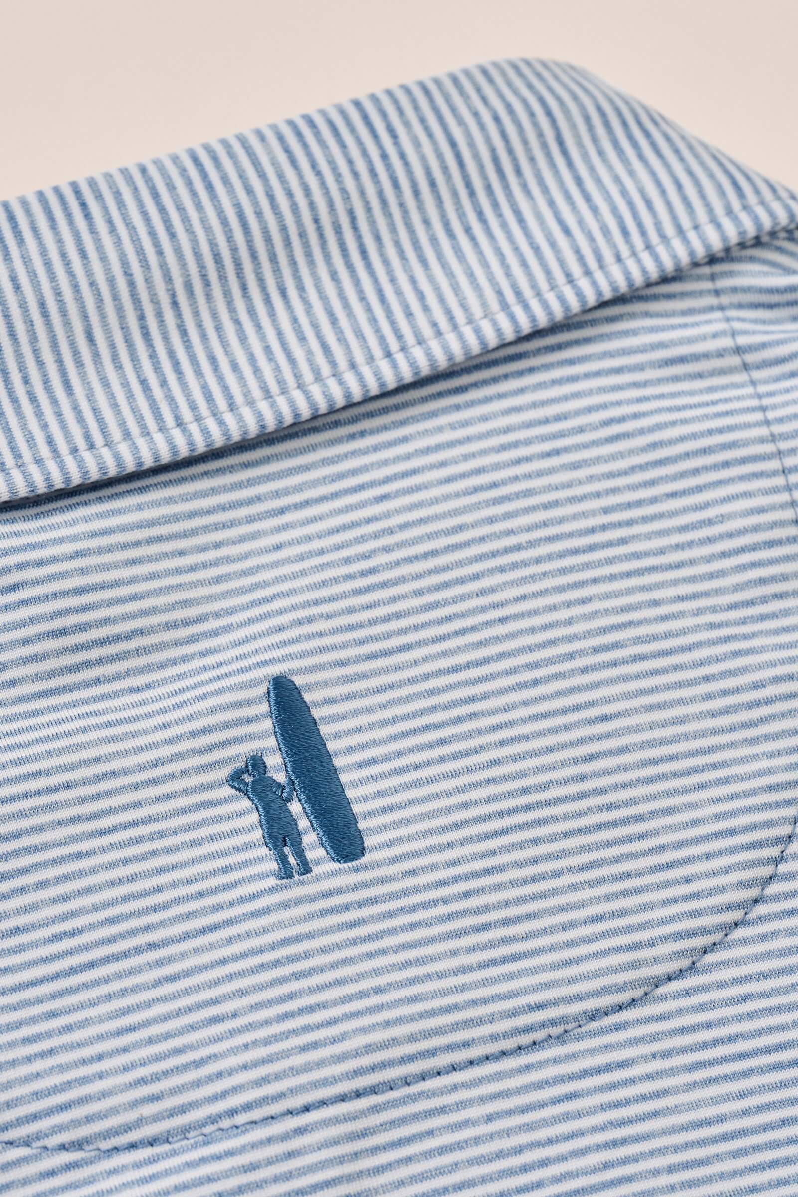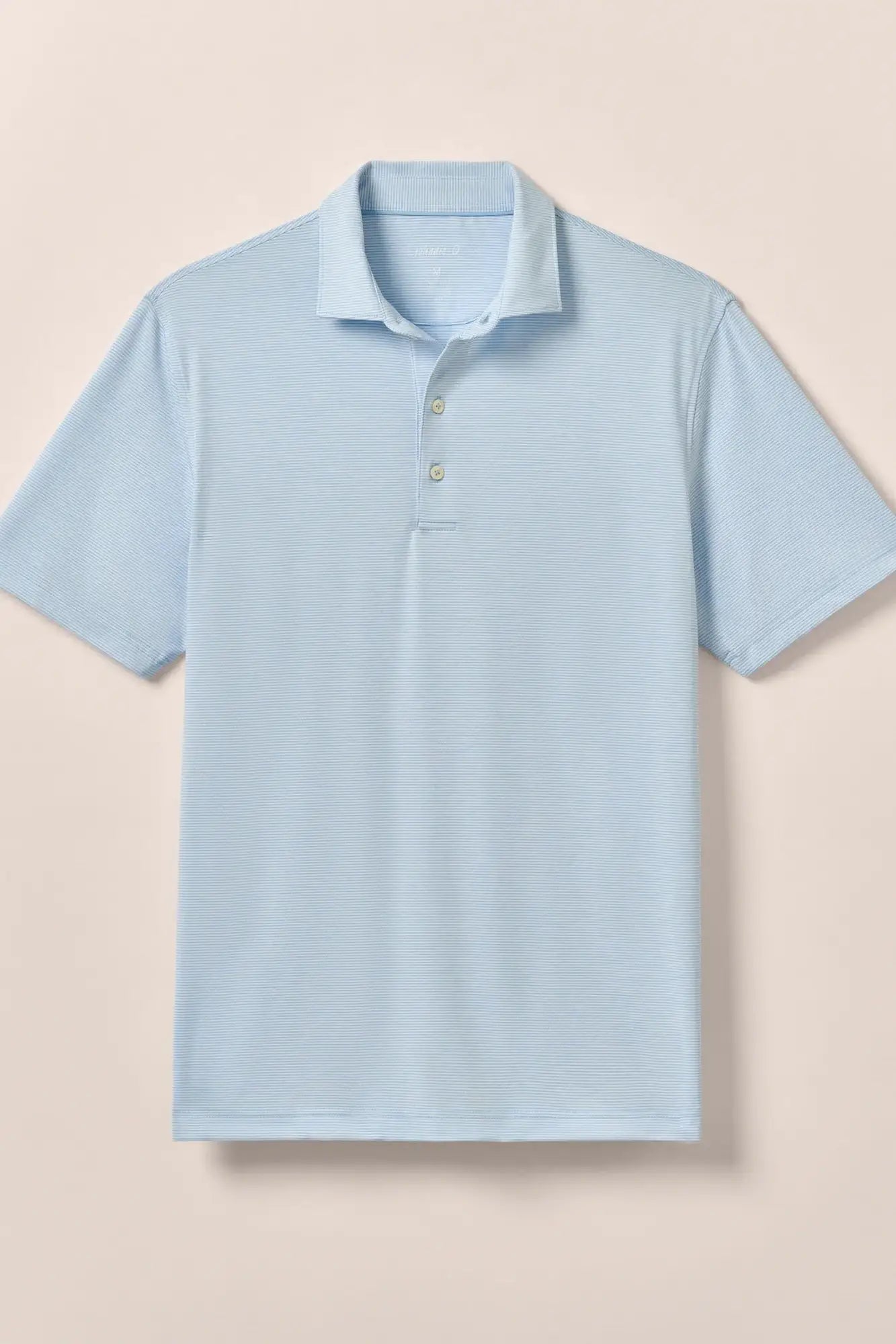 PINSTRIPE PERFORMANCE 3 BUTTON POLO - SIDE VENTS LEFT CHEST OPEN - EMBROIDERED LOGO ON CENTER BACK YOKE - MOISTURE WICKING - UPF 50 SUN PROTECTION