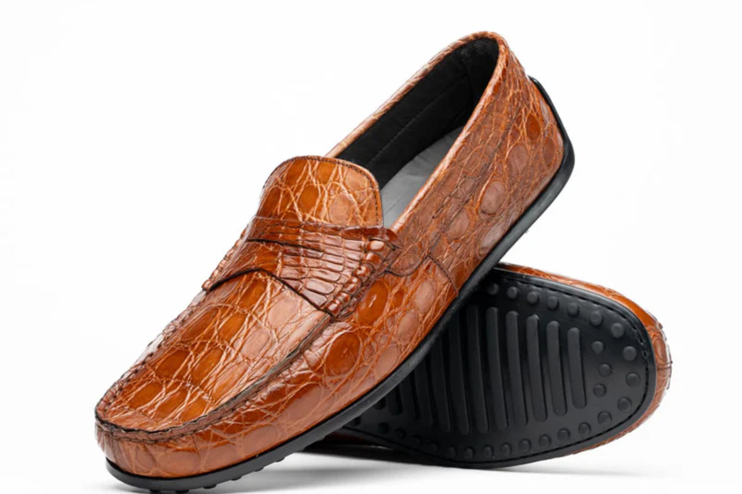 Genuine caiman crocodile with full calfskin linings. Fully cushioned insole for comfort with Italian high performance Gomma driver sole