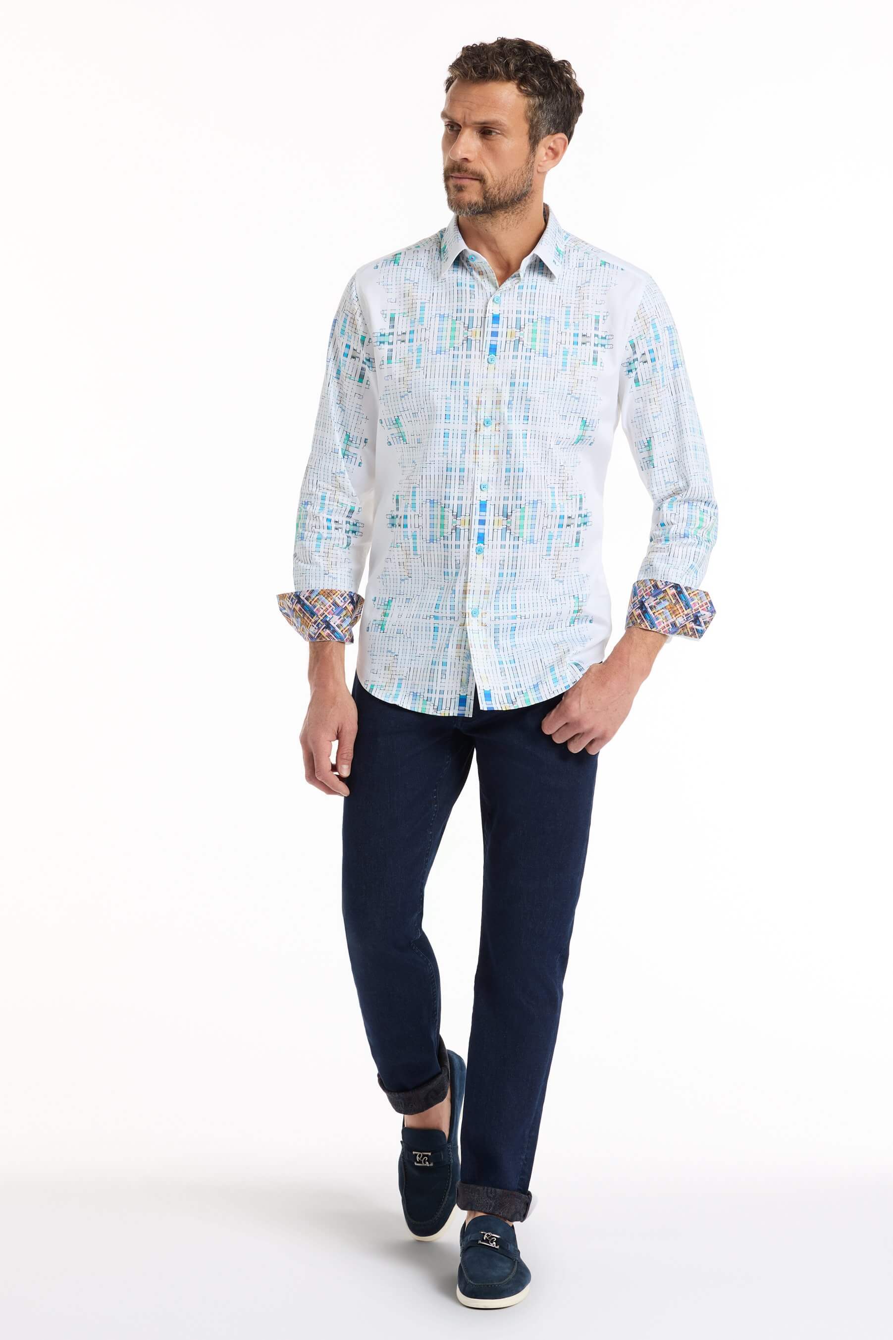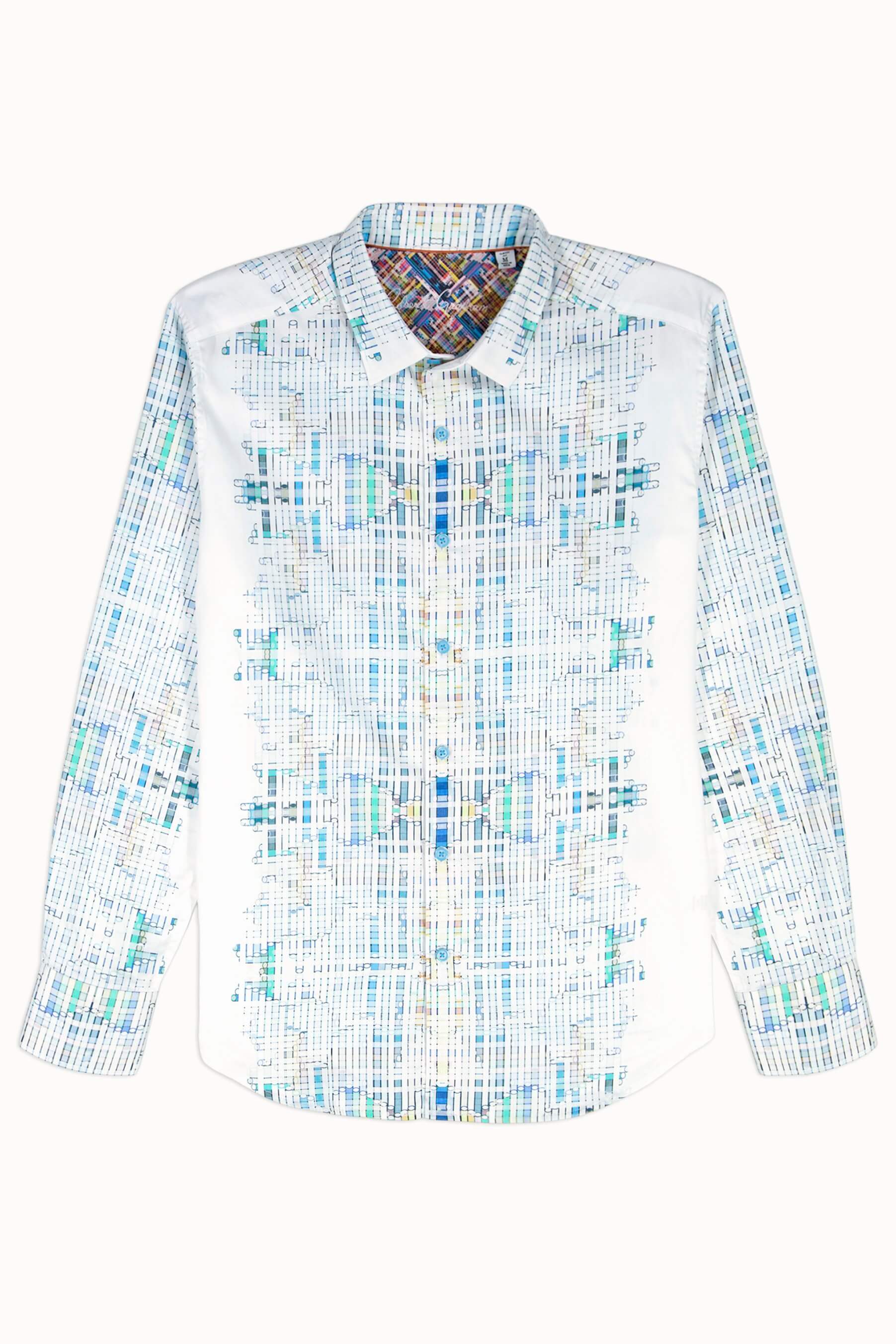 An intricate grid print is elevated with embroidered accents, creating a satin-feel shirt that feels both modern and artfully detailed. The blend of cotton with a touch of stretch ensures comfort without compromising on structure, making this a versatile piece for layering or standing out on its own.