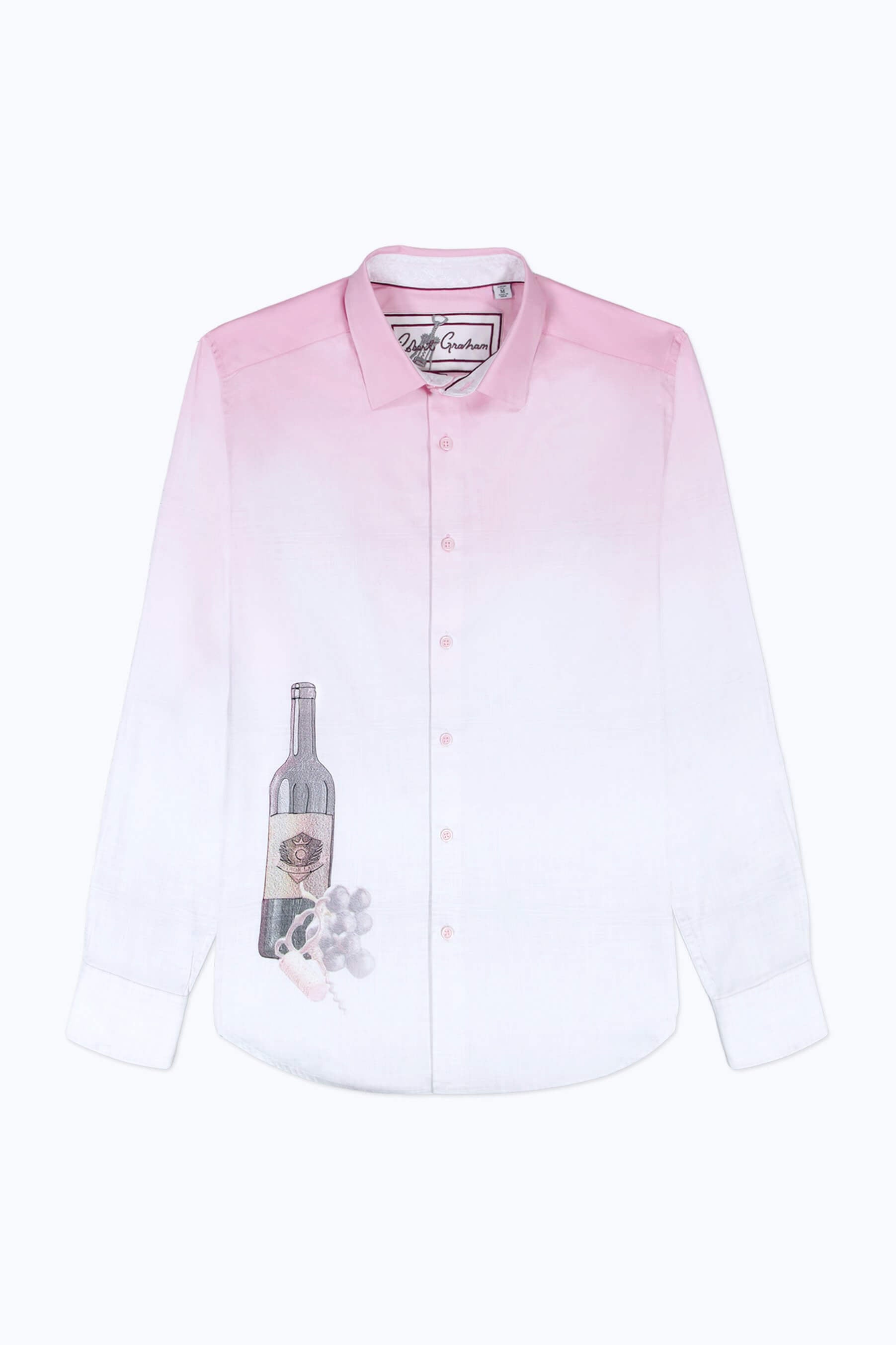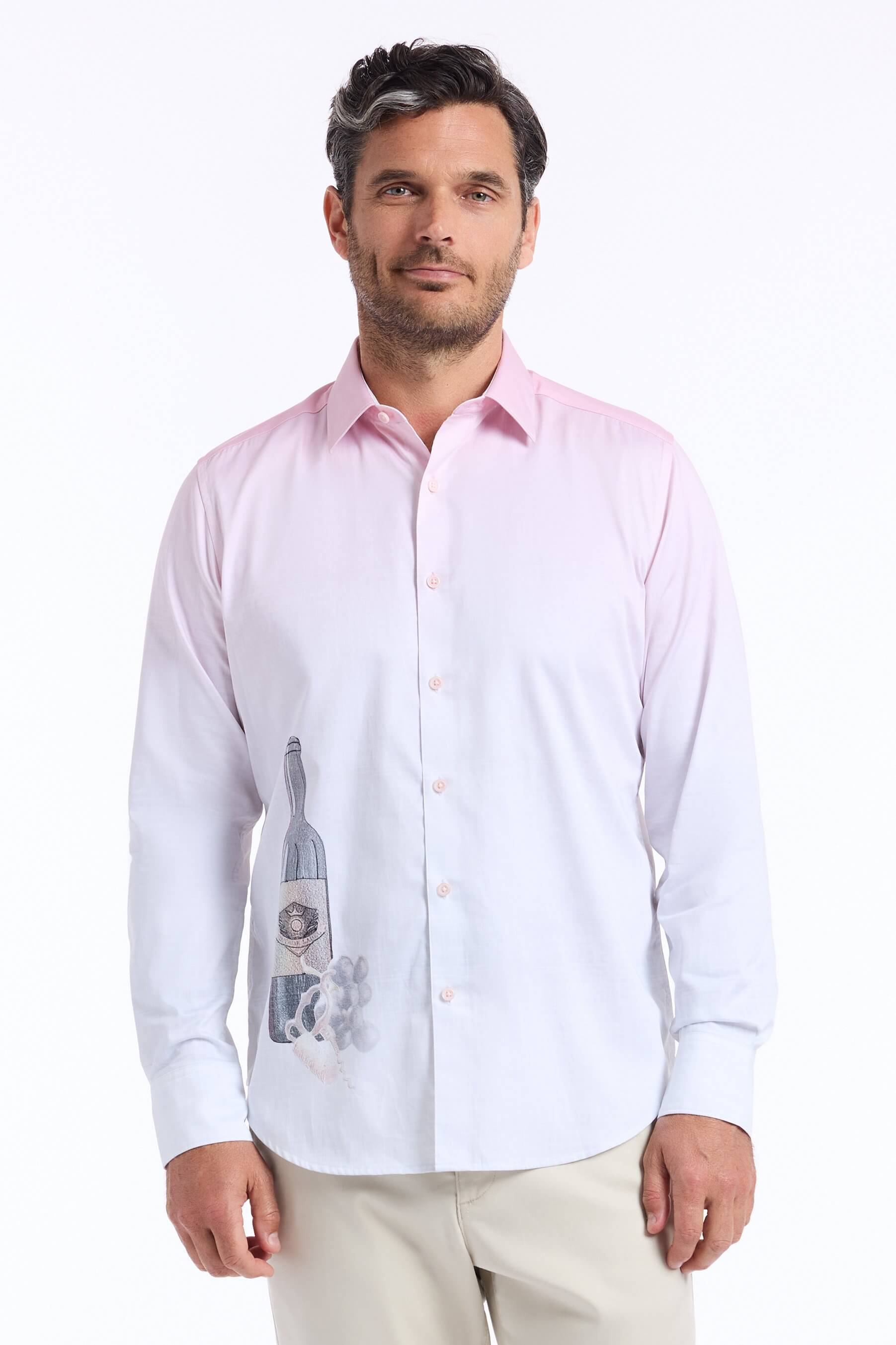 Raise a glass to sophisticated style with a shirt that draws inspiration from the art of winemaking. A subtle ombré background is accented with a cork, grape, and wine bottle motif, blending novelty with legacy reserve. Crafted in smooth cotton sateen, it’s a conversation starter that pairs well with everything from tailored trousers to casual denim.